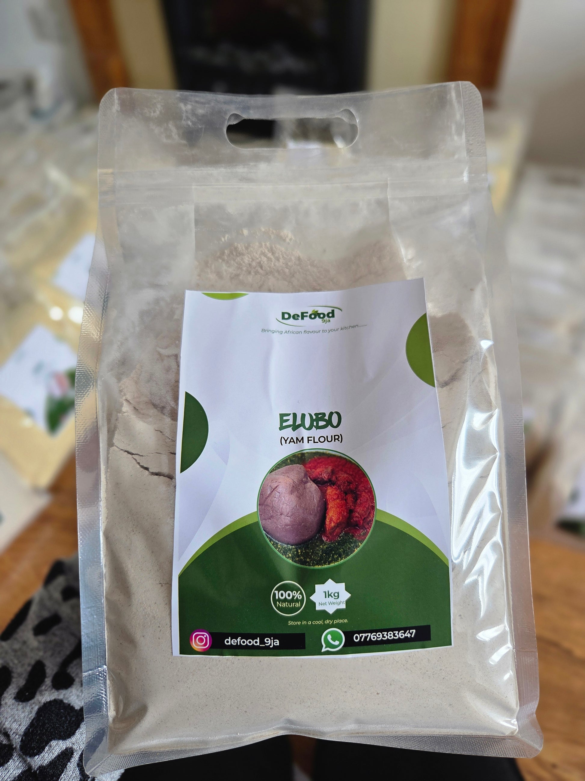 Elubo Isu (Yam Flour) by Defood 9ja, originating from Nigeria. It is a 100% natural, gluten-free, and organic flour made from dried yam. Each pack contains 1.5kg to 4.5kg of smooth yam flour, suitable for main meal dishes in African cuisine. This product is diabetic-friendly and GMO-free, providing around 360-400 kcal per 100g serving. Made in Nigeria.
